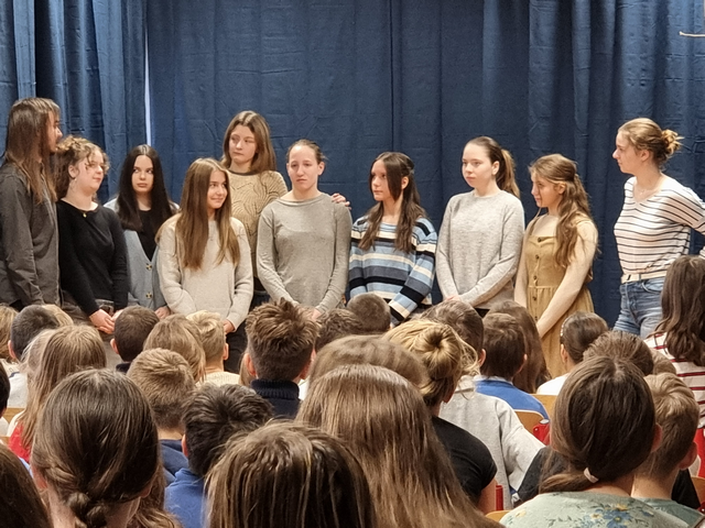 Az ötvenhatos forradalomról idén a nyolcadik osztályosok segítségével emlékeztünk meg. Az akkori eseményeket rövid jelenetekkel és filmrészletekkel idézték fel, elhangzott Vas István Az új Tamás című verse, a gimnazista fiúk és a lányok kórusa pedig egy-egy szép dallal járult hozzá az ünnepléshez.